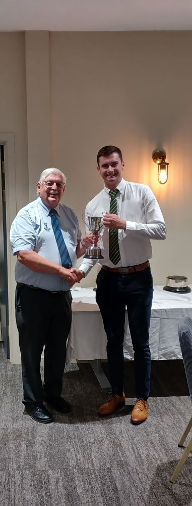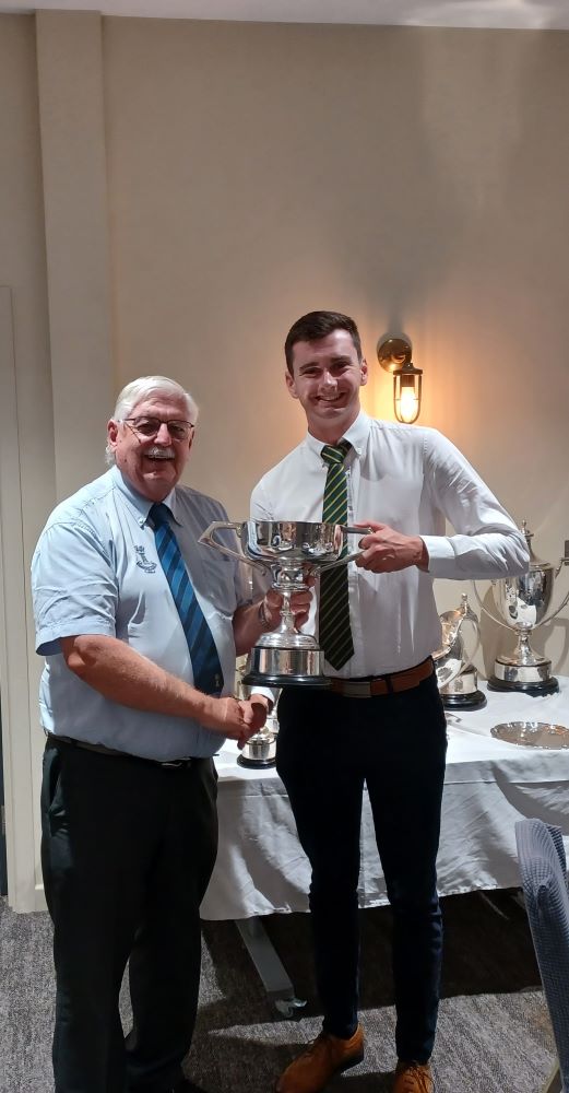 Richard Harris of Cresselly CC, being presented with the trophy by Mr. Brian Hawkins